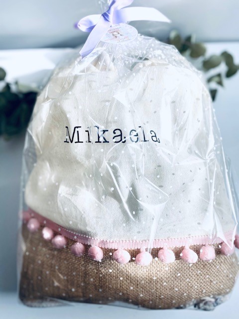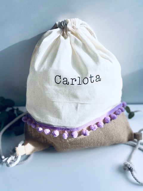 Así de bonita es nuestra mochila personalizada con madroños , ideal para las niñas y va personalizada con el. Esta mochila es práctica para el verano y a la niñas les encanta. Detalles bonitos para eventos mágicos.