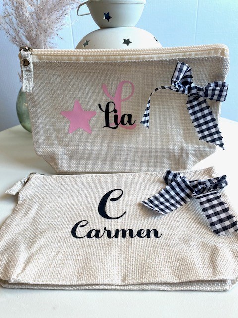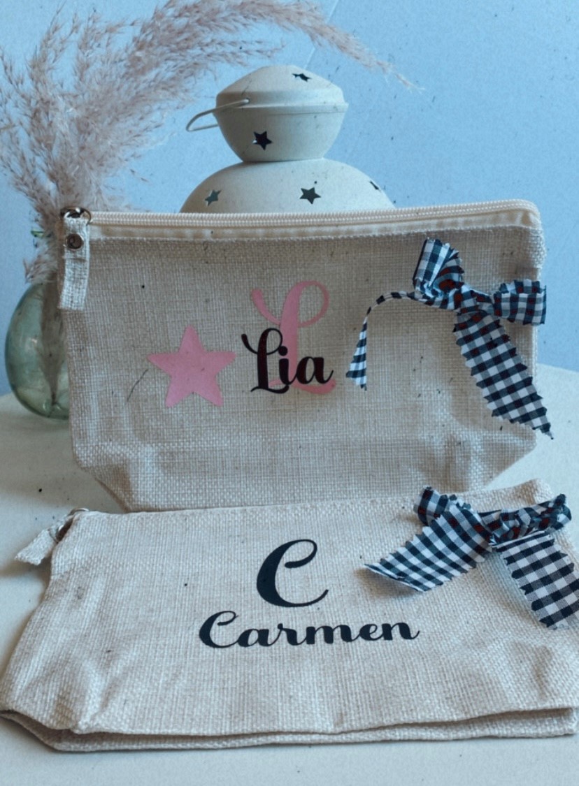 Nuestro neceser con efecto yute y personalizado con el nombre de tus invitados, un detalle ideal y práctico. Así es nuestro neceser cremallera y asa ideal para llevar en el bolso, o como cartera de mano este fino e ideal para cualquier evento.