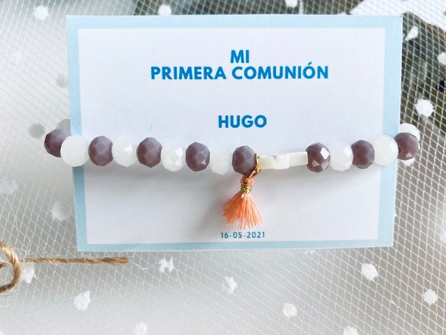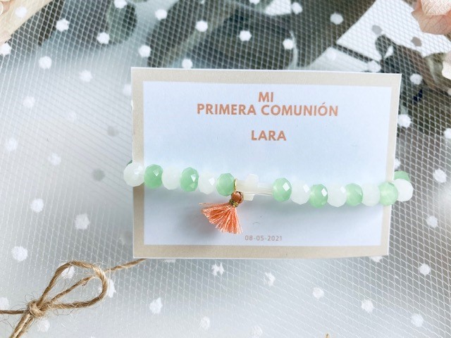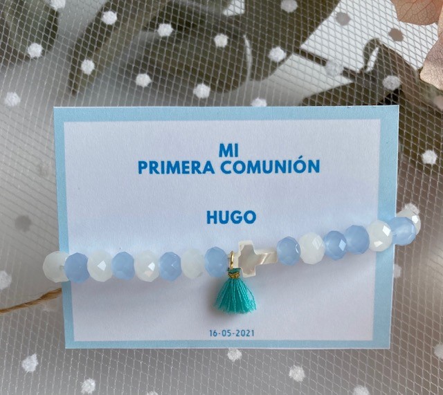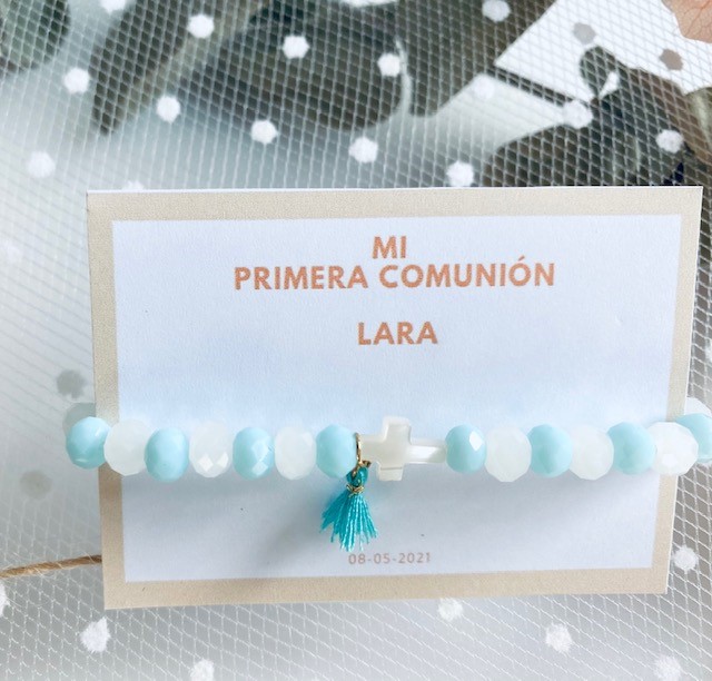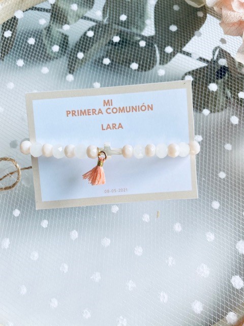 Nuestras pulseras brillo con cruz Nácar y Mini borla, es un detalles perfecto para regalar en vuestros eventos, es ideal para niñas o simplemente para dar como detalle a sus amiguitas.
